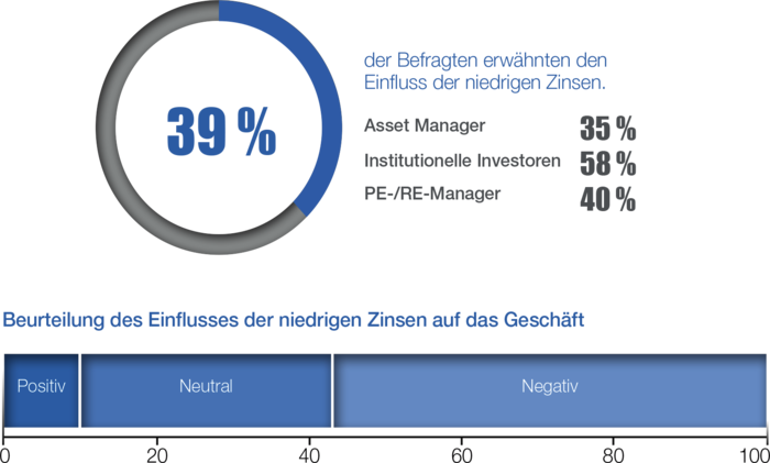 Dies scheint bei Asset Managern, eine geringere Rolle zu spielen: 50% von ihnen sind neutral oder positiv gegenüber dem letztendlichen Einfluss niedriger Zinsen eingestellt, und einige betrachten sie als einen Impuls für die Suche nach stabileren Erträgen.