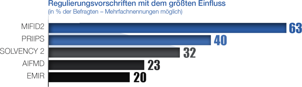 Asset Managers are the most concerned by the costs of adapting to the rapidly-changing regulatory framework, particularly the smallest establishments. MiFID II is regarded as the most disruptive of them all by 63% of respondents, putting distribution model, pricing and cost structures at risk.