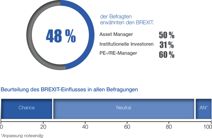 Im Gegensatz dazu sprechen PE-/RE-Manager recht offen über den BREXIT. Ihres Erachtens wird London der wichtigste Finanzplatz bleiben, vor allem für Leveraged Buyouts (LBOs) und Large Caps. Allerdings gilt britisches Kapital als zu stark mit dem Finanzsektor verbunden. Durch den Brexit könnte mehr Kapital nach Europa fließen, insbesondere zugunsten von Small und Mid Caps. Der Nachteil wäre ein höherer Wettbewerb beim Pricing von Zielobjekten und Vermögenswerte am europäischen Markt.
