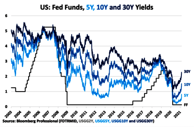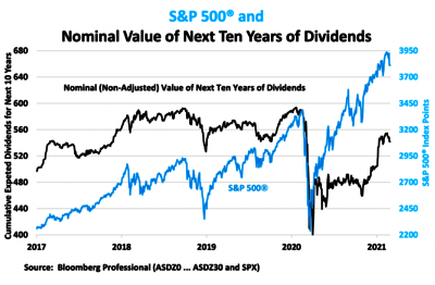 What is curious is that since the beginning of 2017, the expected amount of dividend payments has hardly moved at all. Yet, the S&P 500 index itself has risen by more than 70% (Figure 2). So how is it possible that stock prices have risen so much even as expectations for future dividend payments have gone sideways? The answer lies in fixed income markets. Changing expectations for long-term bond yields influence equity valuations. When long-term yields fall, that raises the net present value (NPV) of future earnings, dividends and other corporate cash flows.