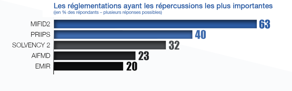 Les sociétés de gestion sont les plus touchés par les coûts liés à l’adaptation à un cadre réglementaire en rapide évolution. C’est d’autant plus vrai pour les établissements de plus petite taille. La directive MiFID II est considérée comme la plus déstabilisante par 63 % des professionnels interrogés, car elle met en péril le modèle de distribution, la tarification et les structures de coûts.